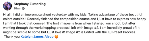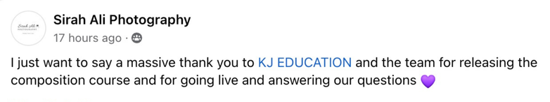 “All I can say is THANK YOU to KJ. You saved my business. You helped me grow, you helped me improve my client experience, you helped me see light, and pose better, and edit faster. You helped me take my business to the next level.”