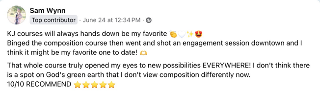 Composition has always been my next-level secret weapon to standing out and now it’s time to share this part of my success with others.... and after educating for over a decade, there is nothing more life-giving than creating a final technical course to complete a collection of transformational shooting resources for photographers! This is truly the icing on cake for KJ Students ready for the final piece of the puzzle!