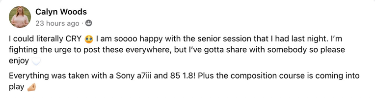 “Because of your valuable teachings, my husband and I have tripled our earnings from our first year in business, we are getting regular inquiries, my ideal clients come to me now, and I finally found my style! New photographers, keep working hard for your dream and invest in education!”