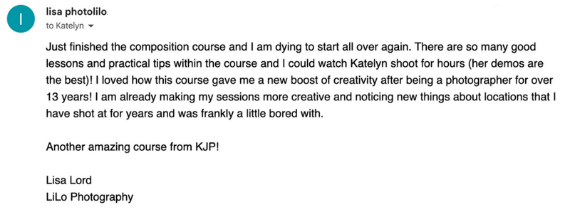 Thanks for all of your wonderful resources! I have the composition course, the consistency course, and the lighting and location course. They've been worth every penny!