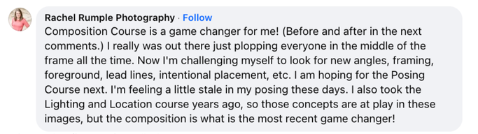 I also appreciated that you did some of the demo videos with a single subject - I spend most of my time photographing seniors, and there were some times that I was struggling to see how the composition resources could be applied without a couple!